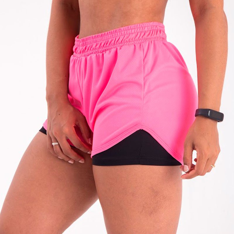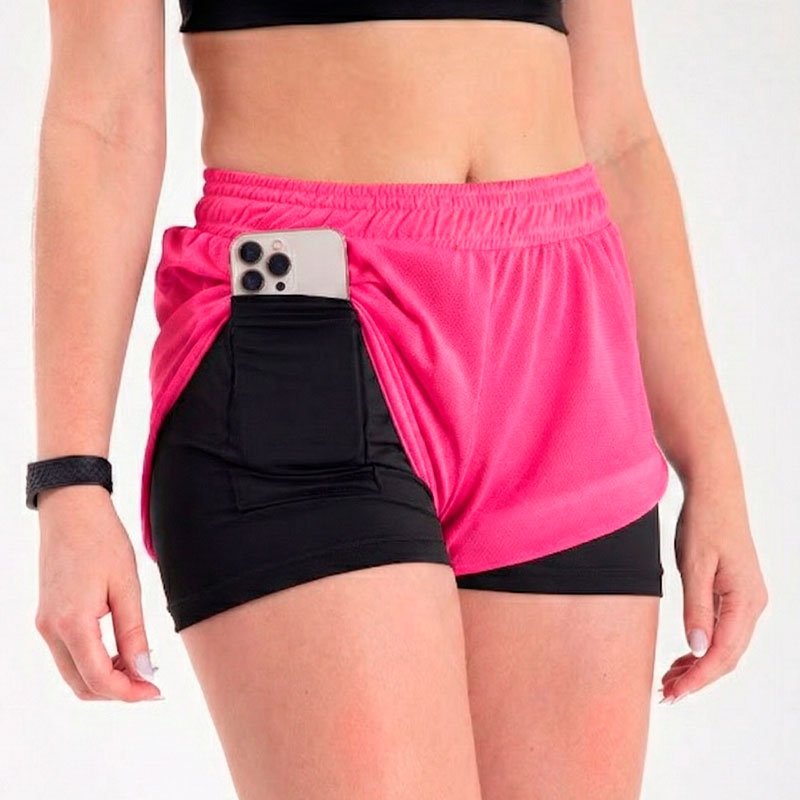 Une bermuda de compressão com bolso oculto + shortinho solto por cima, garantindo suporte, mobilidade e estilo.